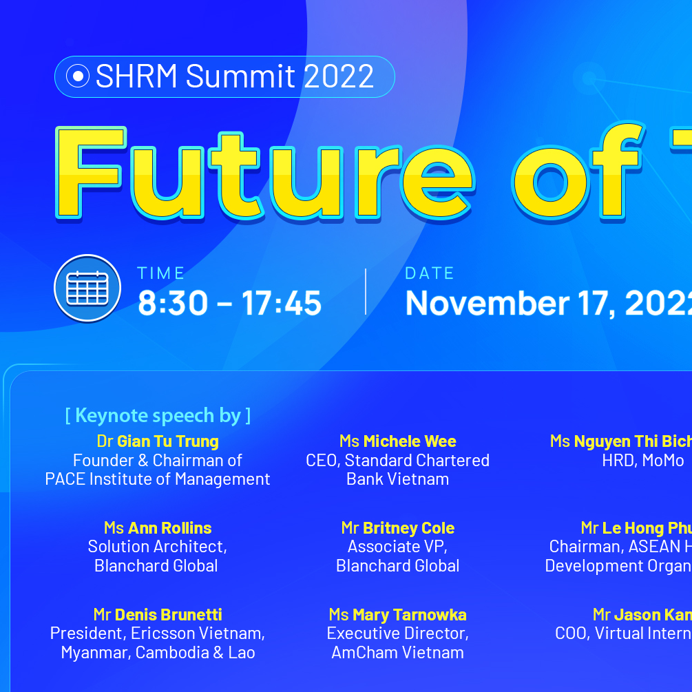 | Nội dung Chương trình | 8:30 Đăng ký tham dự trực tiếp 8:45 Đăng ký tham dự trực tuyến 9:00 AmCham Việt Nam mở đầu chương trình 9:05 Nội dung chính: Future của Talent Management Tiến sĩ Gian Tu Trung, Sáng lập và Hiệu trưởng Trường Doanh Nhân PACE 9:50 Thảo luận: Creating Speak Up Culture Khách mời tham dự: (1) Bà Michele Wee, Tổng Giám Đốc, Ngân hàng Standard Chartered Việt Nam (2) Bà Nguyễn Thị Bích Thủy, Giám Đốc Nhân Sự, MoMo (3) Bà Hằng Nguyễn, Đối Tác Nhân Sự, Baker McKenzie Điều phối: Bà Trần Thị Thư, Giám Đốc Nhân Sự, REE Corporation 10:50 Nghỉ giải lao và tương tác giữa giờ 11:05 Phần 1: The Future Leadership Development - Bà Ann Rollins, Phát Triển Giải Pháp, Blanchard Global - Ông Britney Cole, Phó Chủ Tịch, Blanchard Global 12:05 Ăn trưa 13:30 Check-in tham dự trực tiếp 14:00 Phát biểu mở đầu 14:05 Phần 2: Human Development Ông Lê Hồng Phúc, Chủ tịch, ASEAN Human Development Organization 14:35: Phiên thảo luận: The Future of DEI - Ensuring Inclusion Khách mời tham dự: (1) Ông Dan Bass, Giám Đốc Giải Pháp, Blanchard Việt Nam , Giảng viên SHRM (2) Bà Hồng Nguyễn, Tổng Giám đốc, HR2B (3) Ông Denis Brunetti, Chủ Tịch Ericsson Việt Nam, Myanmar, Campuchia và Lào Điều phối: Bà Mary Tarnowka, Giám Đốc Điều Hành, AmCham Việt Nam 15:25 Phần 3: Building a Remote-first culture Ông Jason Kan, Giám Đốc Điều Hành, Virtual Internships 16:05 Nghỉ giải lao và tương tác giữa giờ 16:15 Phần 4: Develop GenZ Talent Bà Vanessa Ventura, Giám Đốc Nhân Sự, Ogilvy 16:55 Phần 5: Science of Personality - Taking Assessements into the Future/ Khoa học về tính cách Ông Scott Gregory, Giám Đốc Điều Hành, Hogan Assessments 17:35 Bế mạc |